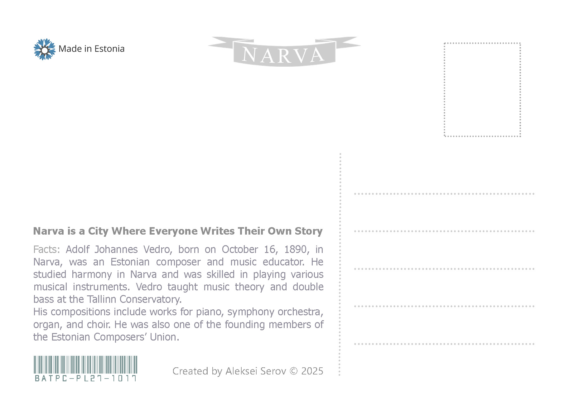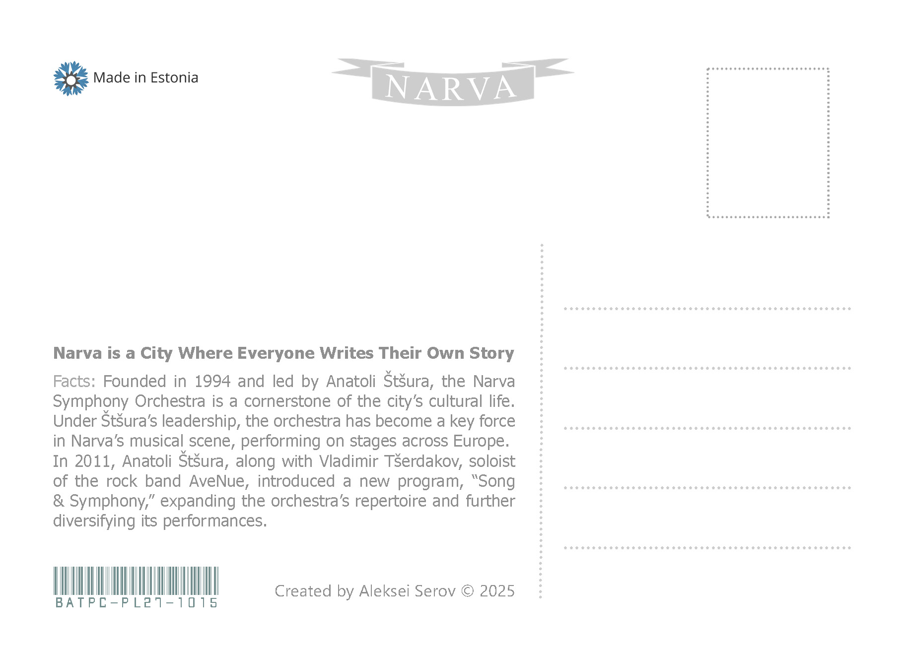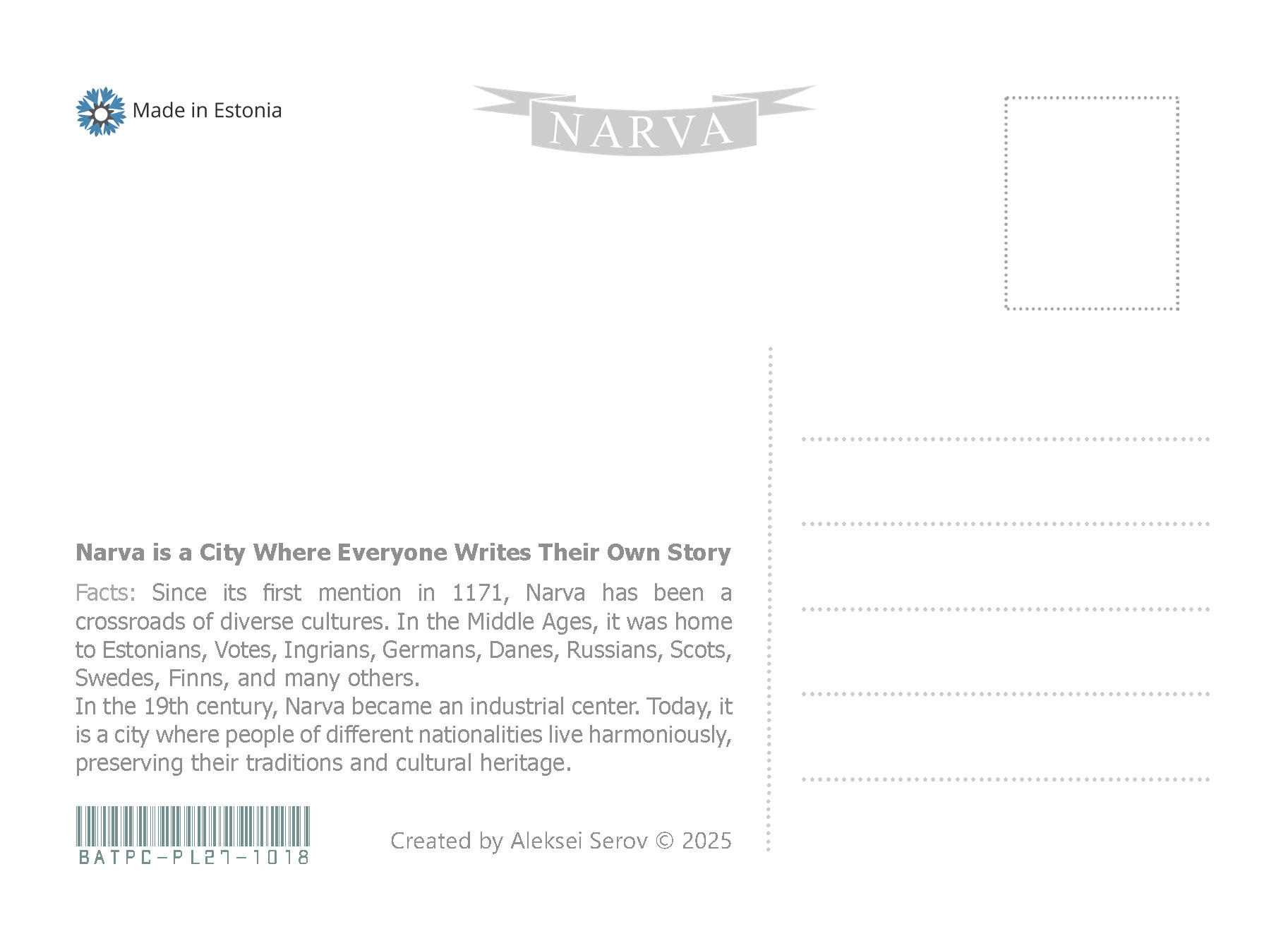 Projekti esimeses etapis lõin postkaardid ja märkmikud, mis pakuvad kohalikele elanikele ja turistidele uut vaatenurka Narva ajaloole. Neid materjale kasutades näitasin, kuidas linna ajaloolisi ja kultuurilisi aspekte saab tõlgendada metafooride ja loominguliste kujundite abil. See on suurepärane vahend harjutusteks, mis on suunatud kujutlusvõime ja loova mõtlemise arendamisele, aidates avastada uusi perspektiive õppimisprotsessis ja õppida vaatama tuttavaid asju ebaharilikust vaatenurgast.