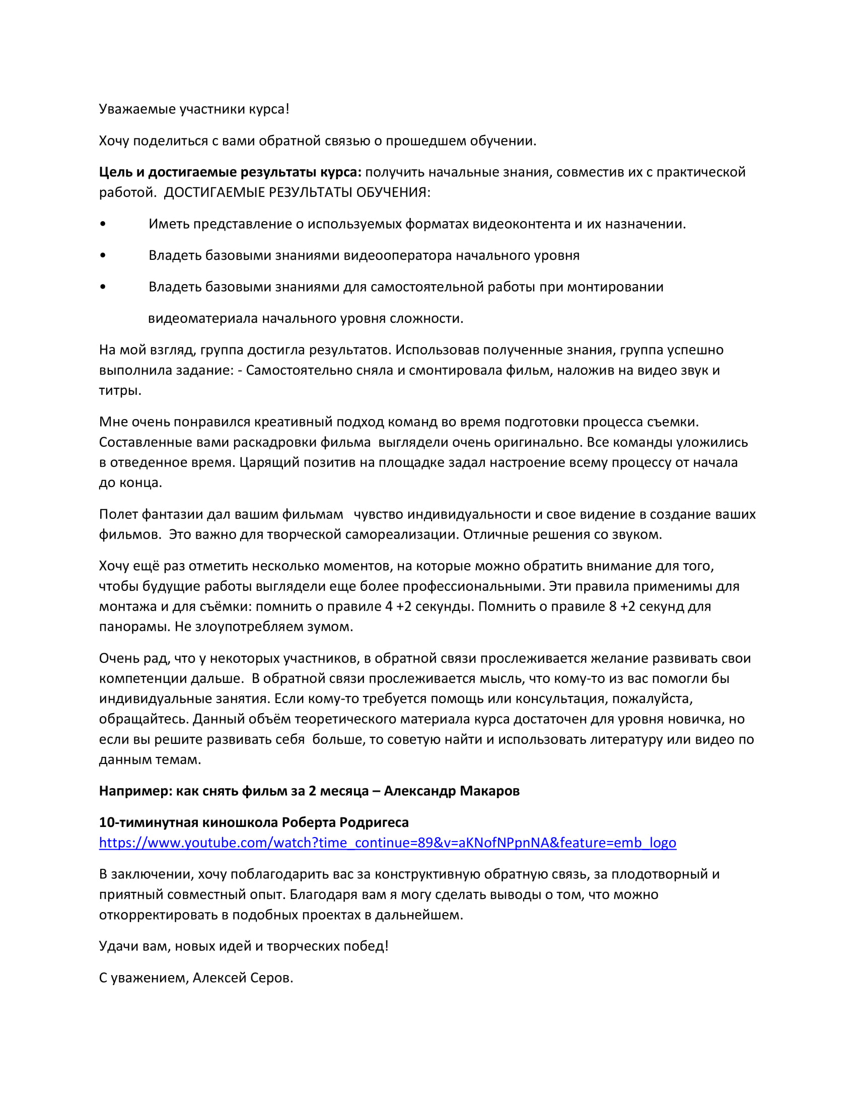 Наглядный пример, для участников. Учебный фильм снятый мною в качестве мастер класса во время практического занятия в первый день курса. Фильм был показан во второй день перед началом практической работы по монтажу.